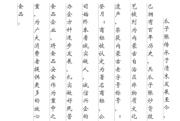 內(nèi)蒙古瓜子張食品有限責(zé)任公司是一家以經(jīng)營堅果炒貨、食用油加工的生產(chǎn)型食品企業(yè),公司于2010年2月注冊為有限責(zé)任公司,坐落在有著8000年紅山文化發(fā)源地——赤峰,占地面積13333㎡、建筑面積8000㎡。